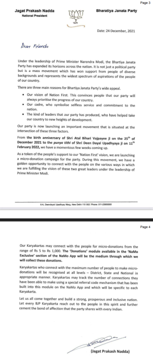 On December 25, 2021, BJP president J.P. Nadda had announced a “micro-donation” campaign to strengthen the party on former prime minister Atal Bihari Vajpayee’s birth anniversary. He had said that the drive will end on February 11, 2022, the death anniversary of Hindutva icon Deen Dayal Upadhyaya.