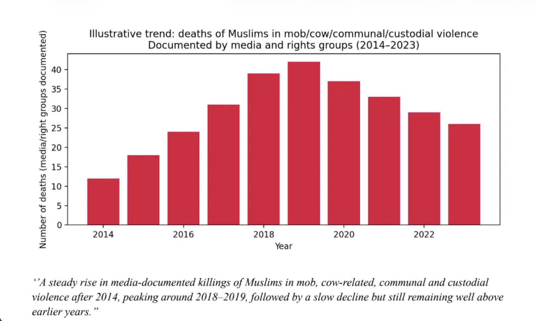 ‘’A steady rise in media-documented killings of Muslims in mob, cow-related, communal and custodial violence after 2014, peaking around 2018–2019, followed by a slow decline but still remaining well above earlier years.’’