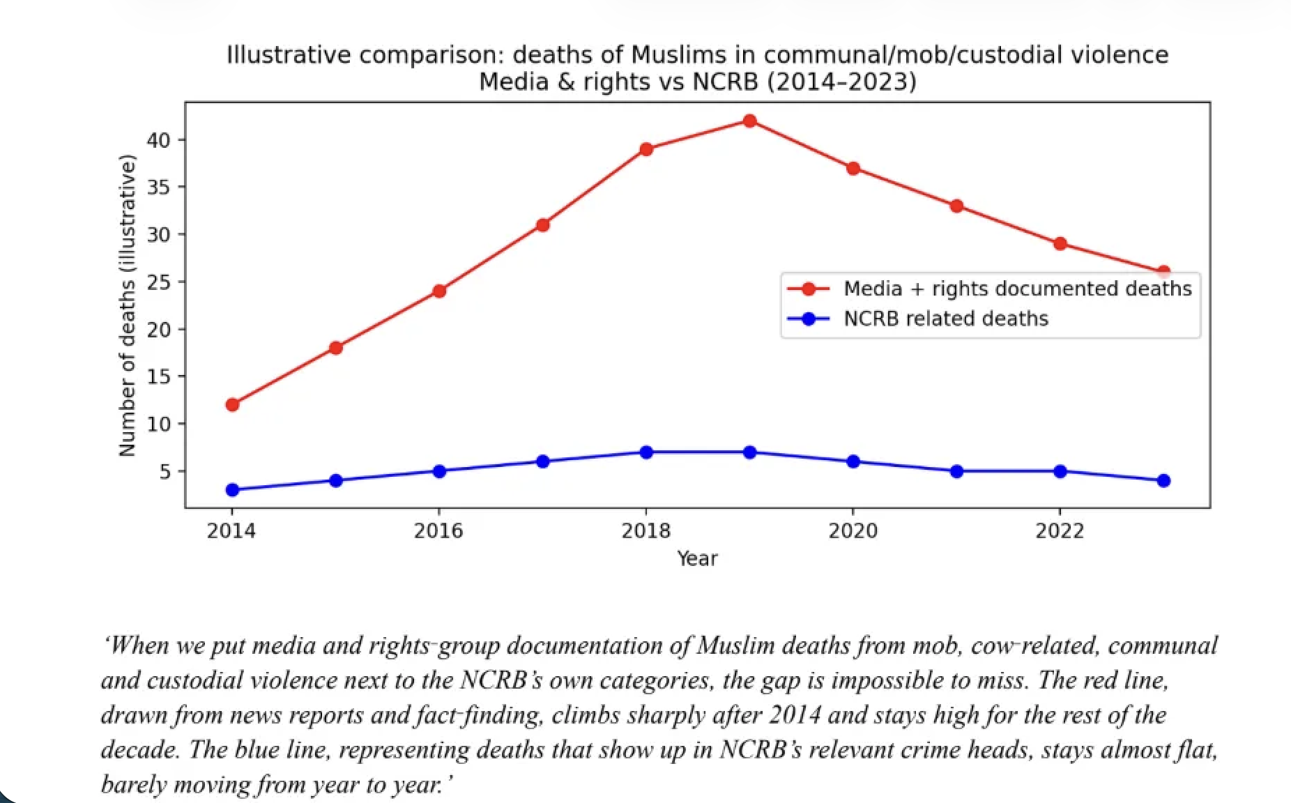“When we put media and rights‑group documentation of Muslim deaths from mob, cow‑related, communal and custodial violence next to the NCRB’s own categories, the gap is impossible to miss. The red line, drawn from news reports and fact‑finding, climbs sharply after 2014 and stays high for the rest of the decade. The blue line, representing deaths that show up in NCRB’s relevant crime heads, stays almost flat, barely moving from year to year.’