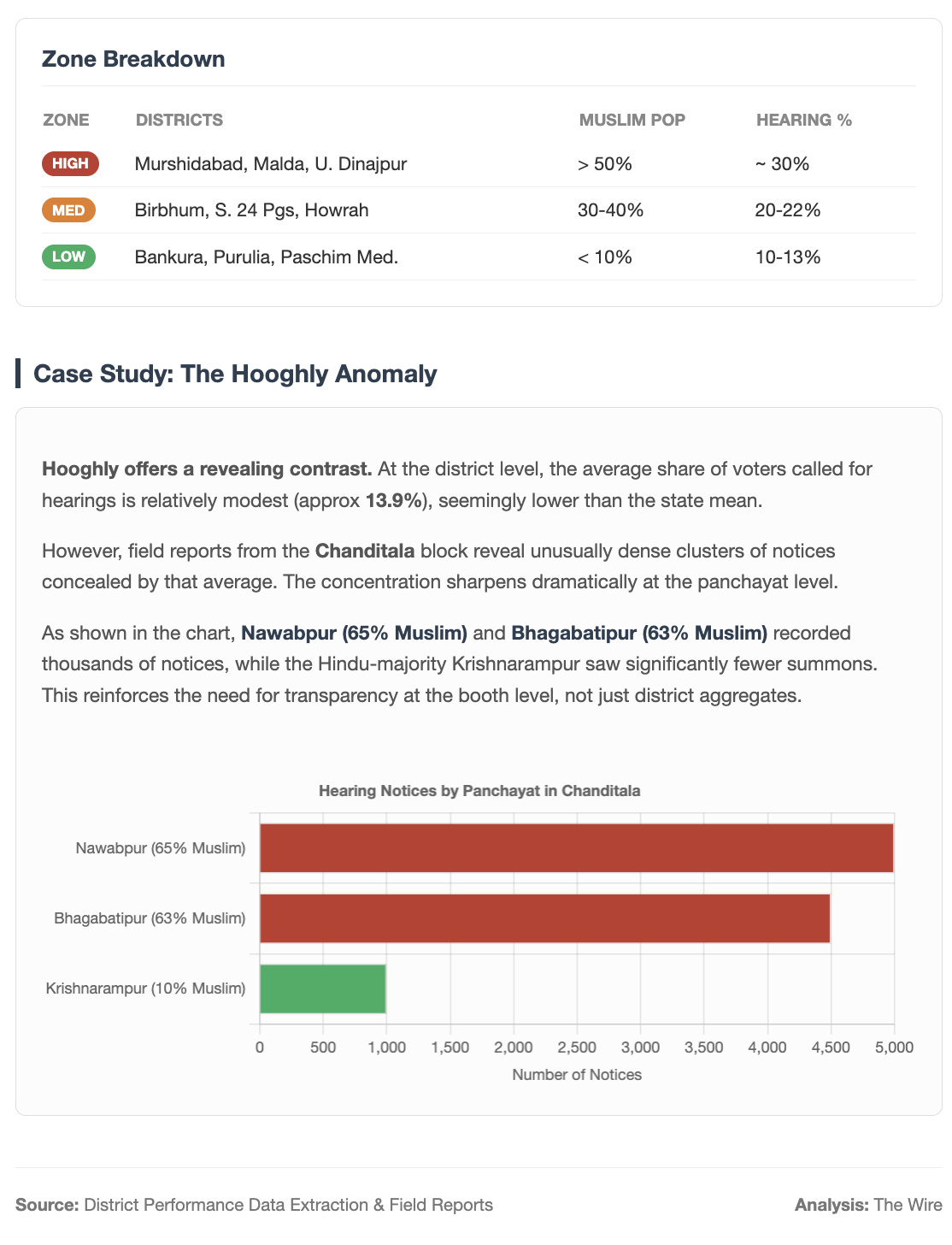 The implication is stark: even where Muslims appear highly “mapped” (low No Mapping), Muslim-heavy districts still show the highest hearing intensity, suggesting the system driving voters into hearings is not primarily No Mapping, but other triggers such as “logical discrepancies”, duplicates and name-related mismatches, especially those amplified by script conversion and rigid matching rules.