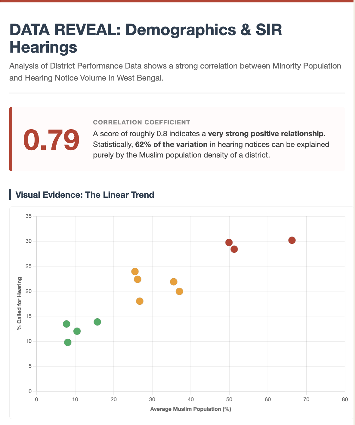 Yet the district-wise hearing numbers reviewed by The Wire tell a sharply different story. Across districts, the share of voters called for hearings climbs steeply with the Muslim population share. Statistical analysis of the dataset shows a strong positive correlation between a district’s Muslim population percentage and the percentage of electors called for hearing per constituency, with a correlation coefficient of 0.79. In practical terms, this implies that approximately 62% of the variation in hearing-call rates across districts can be explained by Muslim population density alone.
