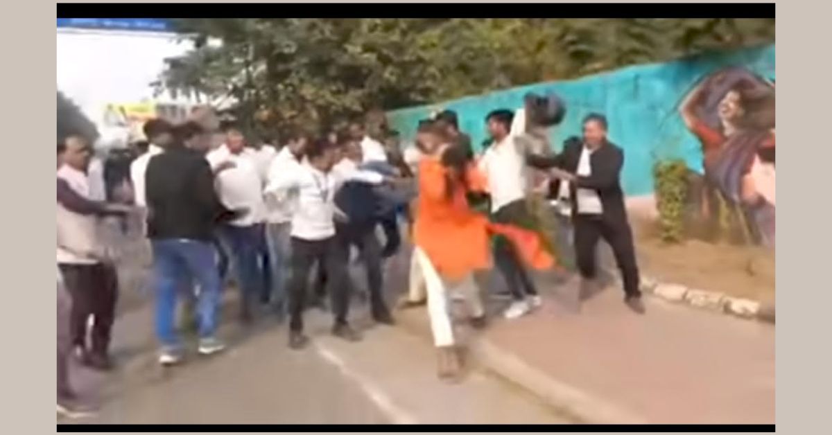 A video circulating on social media shows two men being assaulted by a crowd in the presence of police personnel. The men are reported to be Bajrang Dal leaders who allegedly created a disturbance during an event held in honour of Emperor Ashoka. The incident occurred on Sunday at Manas Bhawan, where the Kuswaha Janjagriti and Vikas Samiti was observing “Priyadarsh Samrat Ashok Mahan Dhamm Day.”