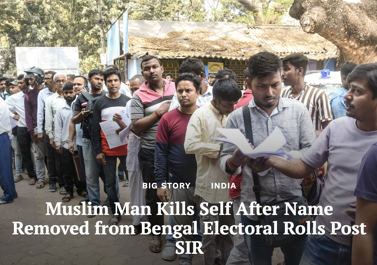 KOLKATA — A Muslim man died by suicide after his name was removed from the electoral rolls in West Bengal following the Special Intensive Revision (SIR) exercise, police said on Monday.