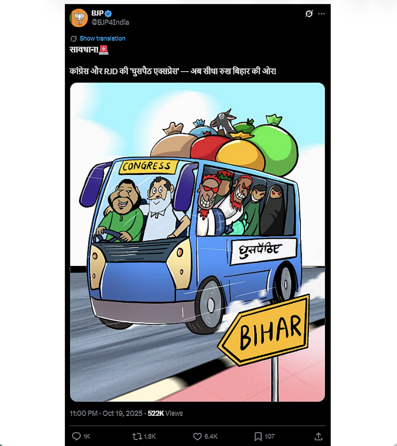 On 19 October, BJP’s official X account posted an insulting graphic which showed a bus supposedly belonging to the RJD and Congress, carrying Muslims labelled as ‘infiltrators.’ These ‘infiltrators’ are visibly shown as ‘evil’ Muslims who are travelling with their belongings, including a goat, towards Bihar.