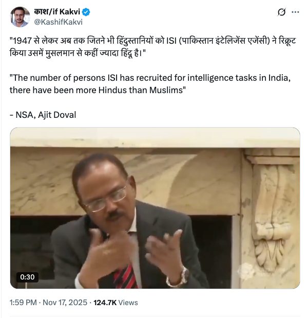 In the wake of the terrorist attack in New Delhi on November 10 that left at least 13 dead and many others injured, a video of National Security Adviser (NSA) Ajit Doval saying that “more Hindus than Muslims have been recruited for ISI tasks in India” went viral. The 35-second clip was widely shared by many to counter the trend of blaming minorities following the attack.