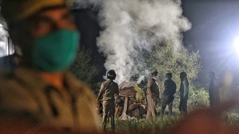 File photo of the Uttar Pradesh Police cremating the Hathras gangrape and murder victim in the middle of the night | Manisha Mondal | ThePrint