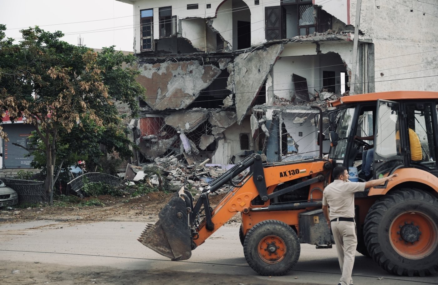 A JCB backhoe excavator after demolishing a Muslim-owned hotel in Haryana’s Nuh on 6 August 2023. The police alleged the building was used to pelt stones during communal clashes in the district on 31 July/ARBAB ALI FOR ARTICLE 14