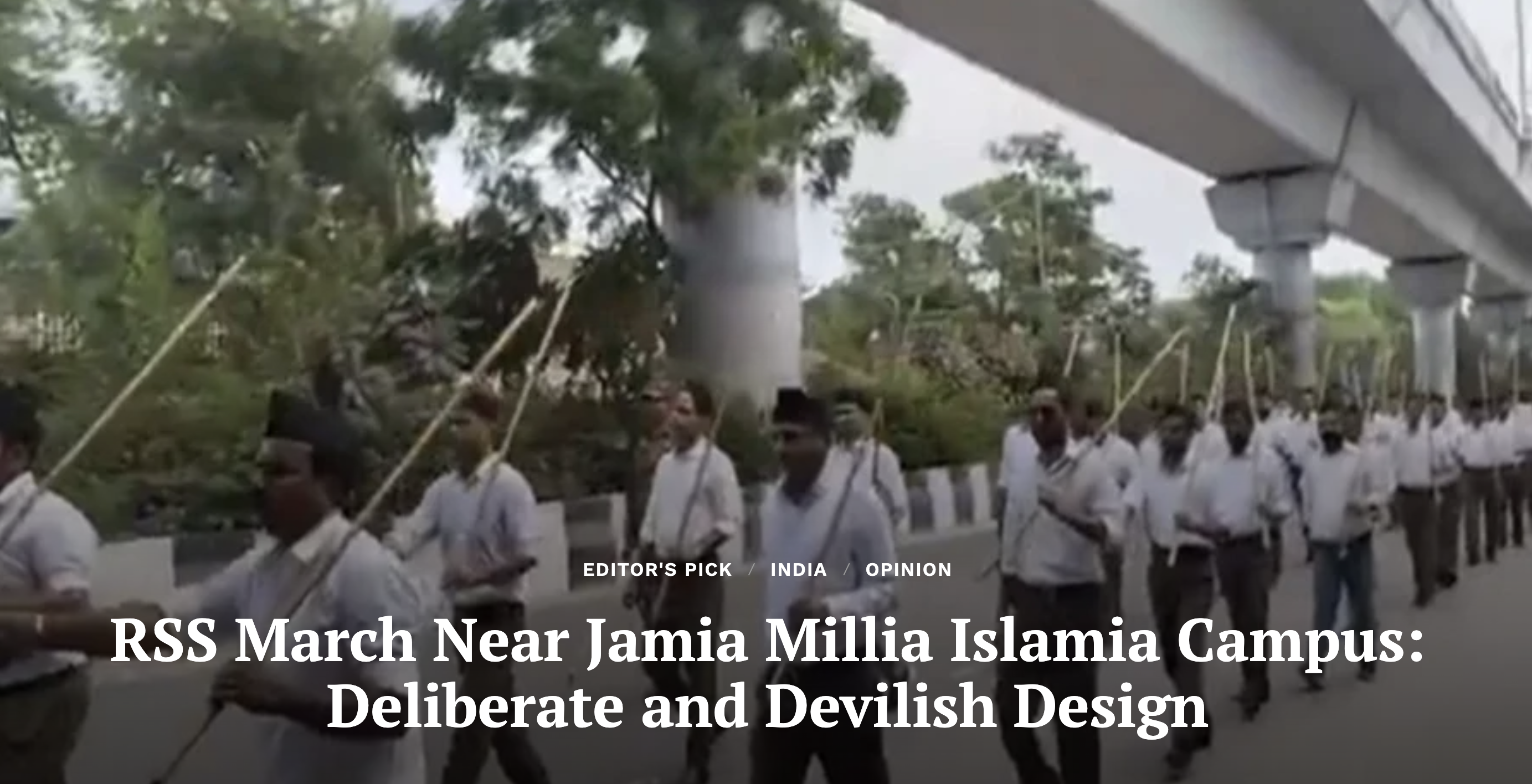 This weekend (5 October), Rashtriya Swayamsevak Sangh (RSS) workers held a march called “Path Sanchalan” near Gate No. 7 and 8 of the university, an embodiment of secularism and pluralism, to celebrate their organisation’s 100th anniversary. Thousands of volunteers, dressed in traditional uniforms and carrying sticks, marched under tight Delhi Police security. This caused a lot of anger and unease among Jamia students, staff, and residents of the nearby localities.